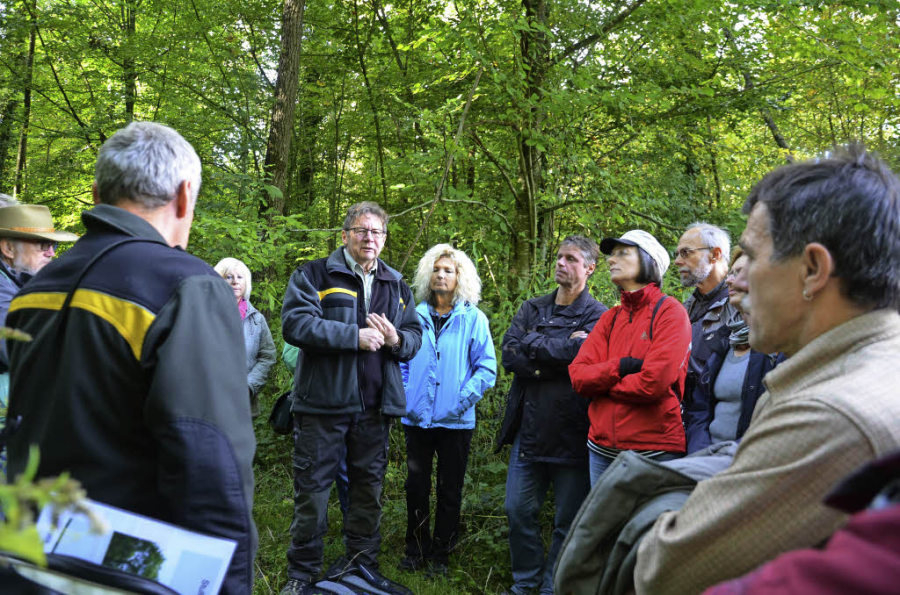 Von Wyhl ging es im Anschluss nach Weisweil. Im Gemeindewald im Gewann Honau, wurde ein vor fünf Jahren auf einer Länge von 500 Metern ausgebaggertes Biotop besichtigt. Unweit davon nahmen die Exkursions-Teilnehmer einen jüngeren Eschen-Stangenwald in Augenschein, dessen Bäume vom derzeit grassierendem Sterben stark betroffen sind. Forstamtsdirektor Jürgen Schmidt informierte zu diesem Wald, erläuterte das Eschensterben und erklärte, dass an dieser Stelle alle Eschen gefällt werden müssten. In der gegenüberliegenden zwei Hektar großen Neuanpflanzung mit etwa 30 Prozent Eichen und anderen Baumarten wächst zur Freude der Förster sowie Bürgermeister Michael Baumann die Neuanpflanzung prächtig.