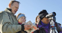Weisweil. Während die Einen durch das Spektiv die Wasservögel beobachteten, erläuterte Naturschutzwart Klaus Mathes (mit Bestimmungsbuch) den anderen die Wasservögel. Foto: Roland Vitt